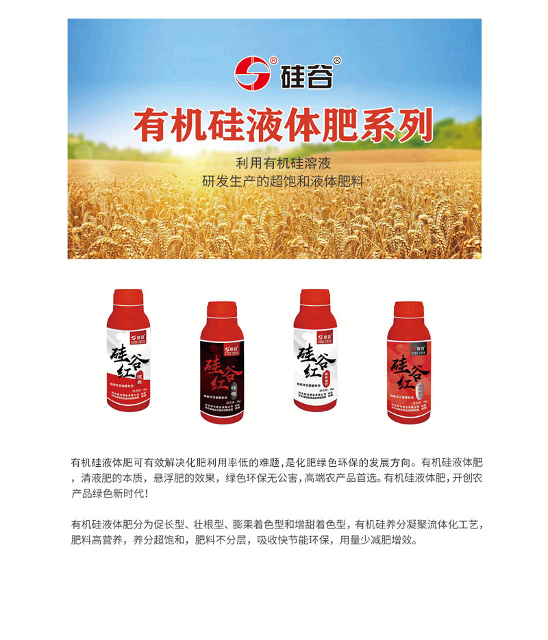 Organosilicon liquid fertilizer is another revolution of chemical fertilizer. It is an inevitable way to solve the problem of low utilization rate of chemical fertilizer and the development direction of green and environmental protection of chemical fertilizer. Organosilicon liquid fertilizer is the essence of clear liquid fertilizer, the effect of suspended fertilizer, environmental protection and pollution free, the first choice of high-end agricultural products. Organosilicon liquid fertilizer, create a new era of green agricultural products! Leading agriculture, Silicon Valley win in the peak with you!